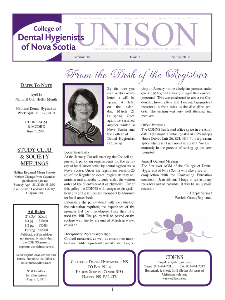 Nonofficial Newsletter of the College of Dental Hygienists of Nova ScotiaMailed under Canada Post Publications Mail Sales Agreement No. 1925350Dates To Note April is National Oral Health Month National