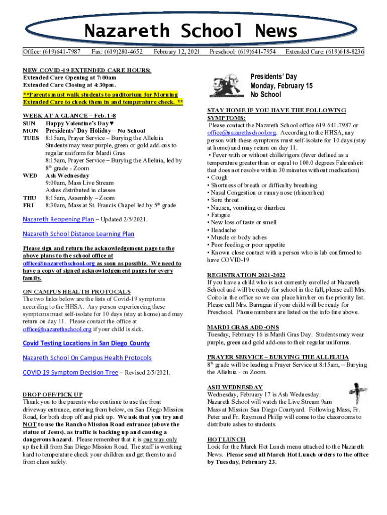 Nazareth School News Office: (619)6417987Fax: (619)2804652NEW COVID-19 EXTENDED CARE HOURS: Extended Care Opening at 7:00am Extended Care Closing at 4:30pm. Title February 12, 2021**Parents must walk