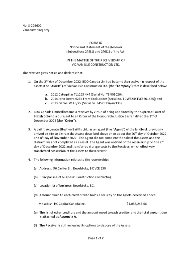 No. S229602 Vancouver Registry FORM 87 Notice and Statement of the Receiver (Subsections 245(1) and 246(1) of the Act) IN THE MATTER OF THE RECEIVERSHIP OF VIC VAN ISLE CONSTRUCTION LTD. The receiver