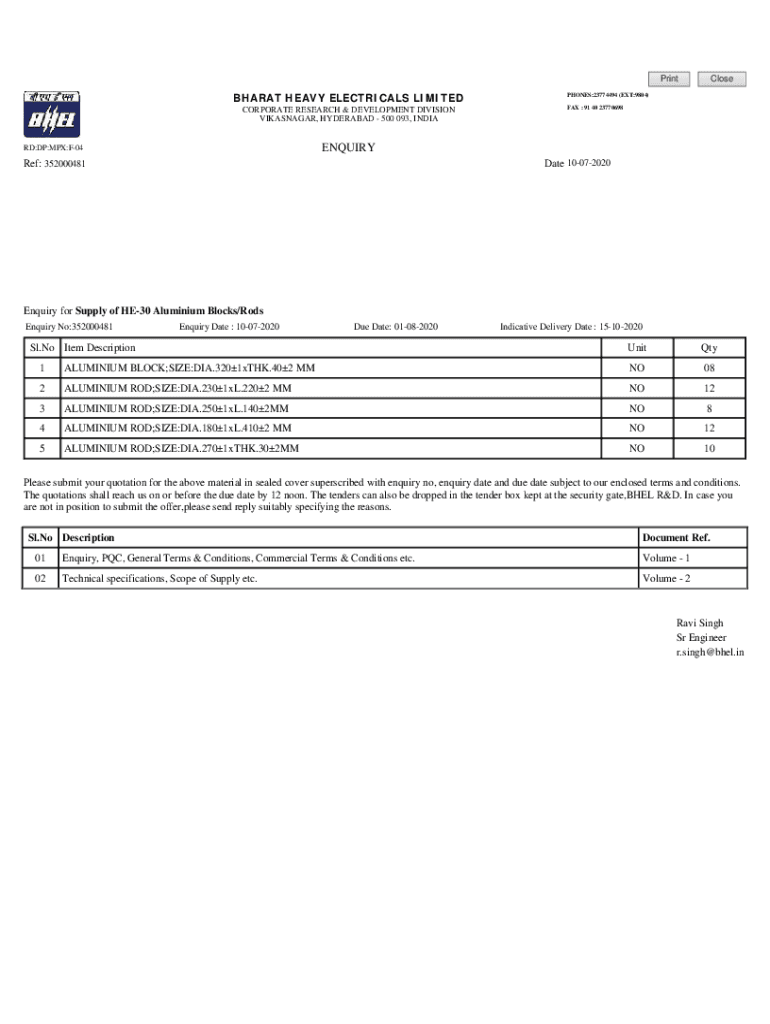 PrintBHARAT HEAVY ELECTRICAL LIMITED CORPORATE RESEARCH & DEVELOPMENT DIVISION VIJAYANAGAR, HYDERABAD 500 093, INDIAClosePHONES:23774494 (EXT:9804) FAX : 91 40 23770698ENQUIRYRD:DP:MPX:F04Ref: 352000481Date