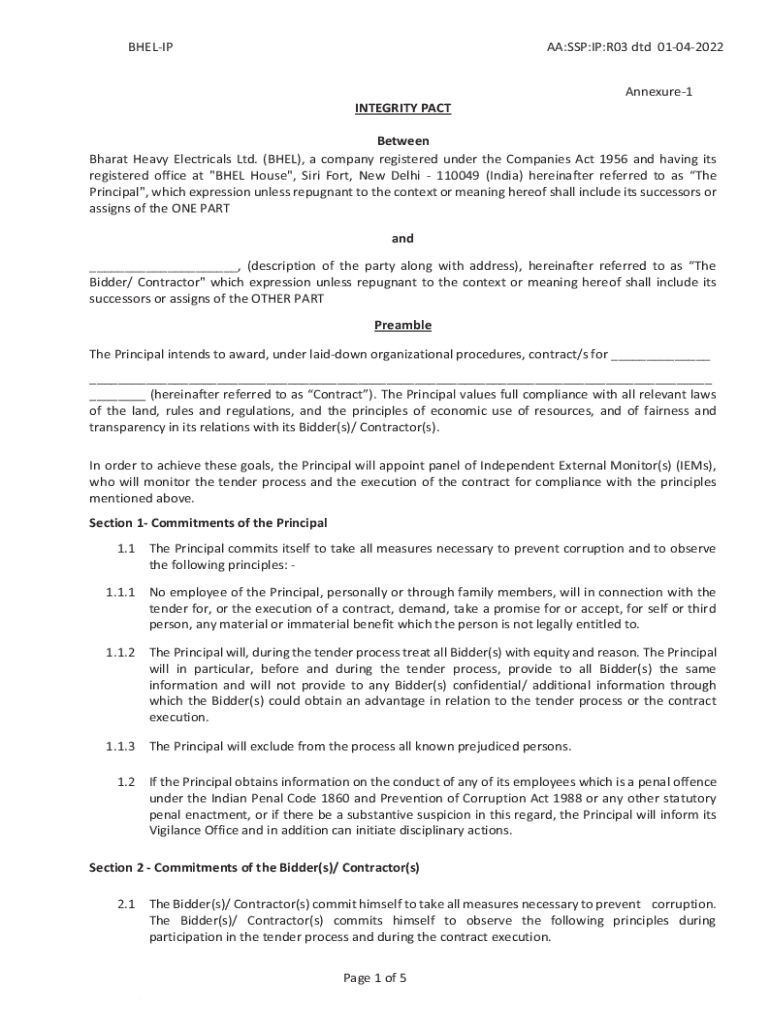 HELIPAD:SSP:IP:R03 did 01042022 Annexure1 INTEGRITY PACTBetween Bharat Heavy Electrical Ltd. (BAEL), a company registered under the Companies Act 1956 and having its registered office at \” BAEL