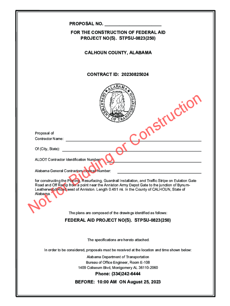 PROPOSAL NO. ___ FOR THE CONSTRUCTION OF FEDERAL AID PROJECT NO(S). STPSU0823(250) CALHOUN COUNTY, ALABAMACONTRACT ID: 20230825024Proposal of Contractor Name:r o Gogh (City, State):n o i t c u rt