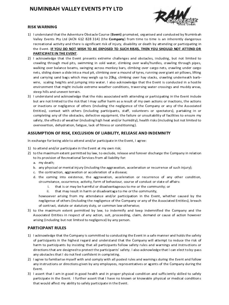 NOMINAL VALLEY EVENTS PTY LTD RISK WARNING 1) I understand that the Adventure Obstacle Course (Event) promoted, organized and conducted by Nominal Valley Events Pty Ltd (ACN 612 828 314) (the Company)