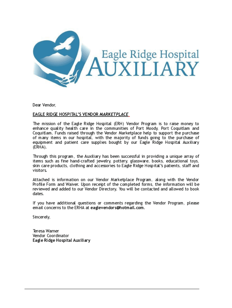 Dear Vendor, EAGLE RIDGE HOSPITALS VENDOR MARKETPLACE The mission of the Eagle Ridge Hospital (ERA) Vendor Program is to raise money to enhance quality health care in the communities of Port Moody,