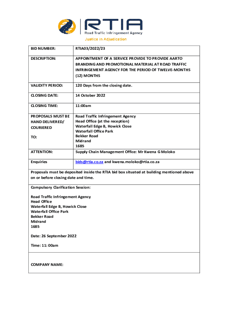 BID NUMBER:RTIA03/2022/23DESCRIPTION:APPOINTMENT OF A SERVICE PROVIDE TO PROVIDE SARTO BRANDING AND PROMOTIONAL MATERIAL AT ROAD TRAFFIC INFRINGEMENT AGENCY FOR THE PERIOD OF TWELVEMONTHS (12) MONTHSVALIDITY