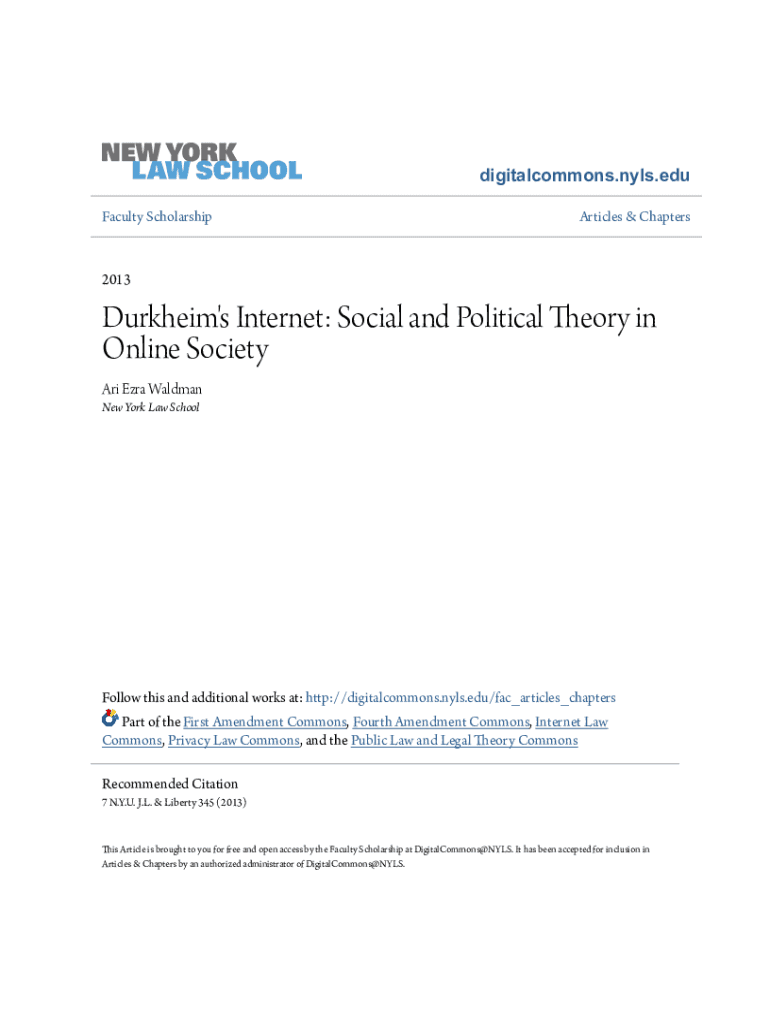 Digital commons.NLS.edu Faculty ScholarshipArticles & Chapters2013Durkheim\'s Internet: Social and Political Theory in Online Society ARI Ezra Waldman New York Law Schoolfellow this and additional