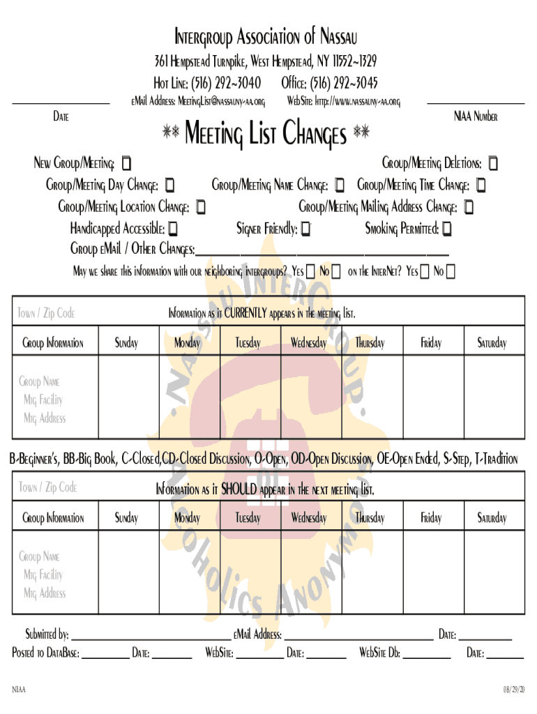 Intergroup Association of Nassau ___ Date361 Hempstead Turnpike, West Hempstead, NY 115521329 Hot Line: (516) 2923040 Office: (516) 2923045 email Address: MeetingList@nassaunyaa.orgWebSite: http://www.nassaunyaa.orgMeeting