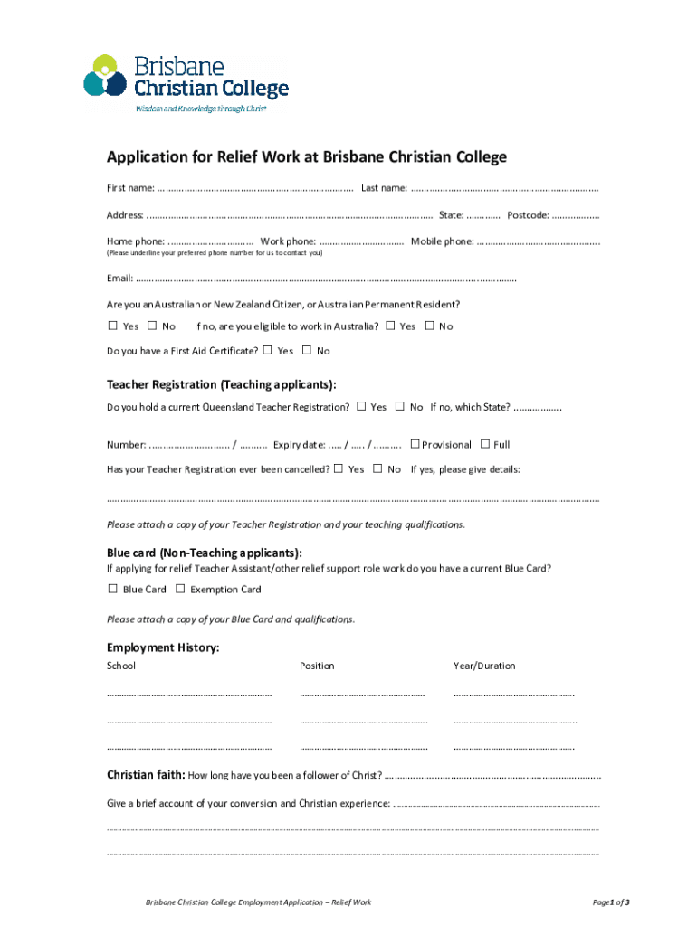 ApplicationforReliefWorkatBrisbaneChristianCollege First name:......................................................................... Lastname:......................................................................
