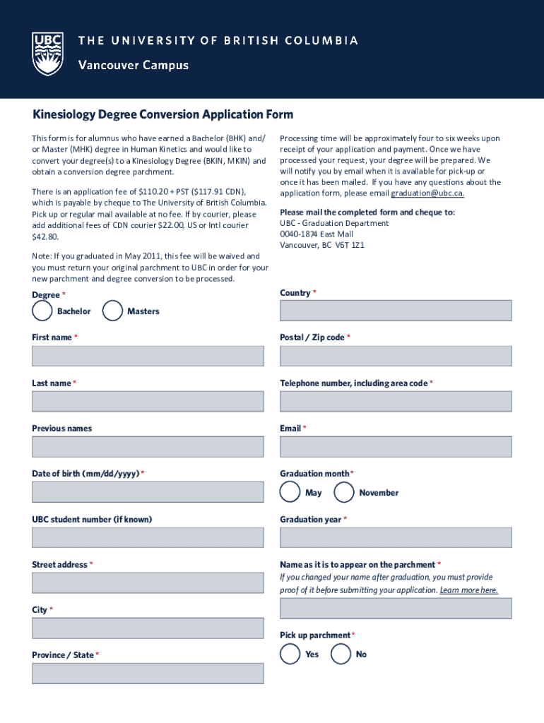 Kinesiology Degree Conversion Application Form This form is for alumnus who have earned a Bachelor (HK) and/ or Master (HK) degree in Human Kinetics and would like to convert your degree(s) to a Kinesiology