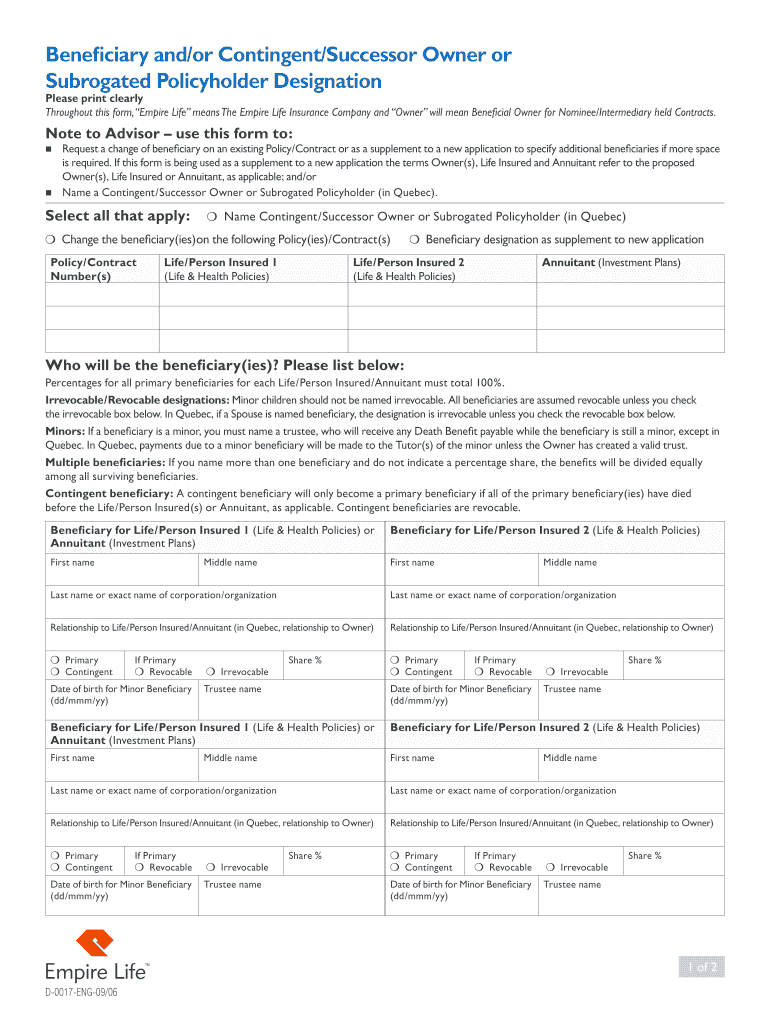 Beneficiary and/or Contingent/Successor Owner or Surrogate Policyholder Designation Please print clearly Throughout this form, Empire Life means The Empire Life Insurance Company and Owner will mean