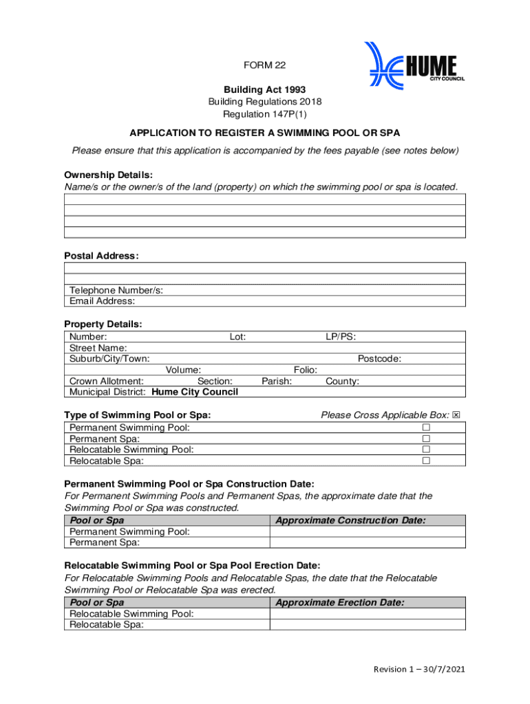 FORM 22 Building Act 1993 Building Regulations 2018 Regulation 147P(1) APPLICATION TO REGISTER A SWIMMING POOL OR SPA Please ensure that this application is accompanied by the fees payable (see notes