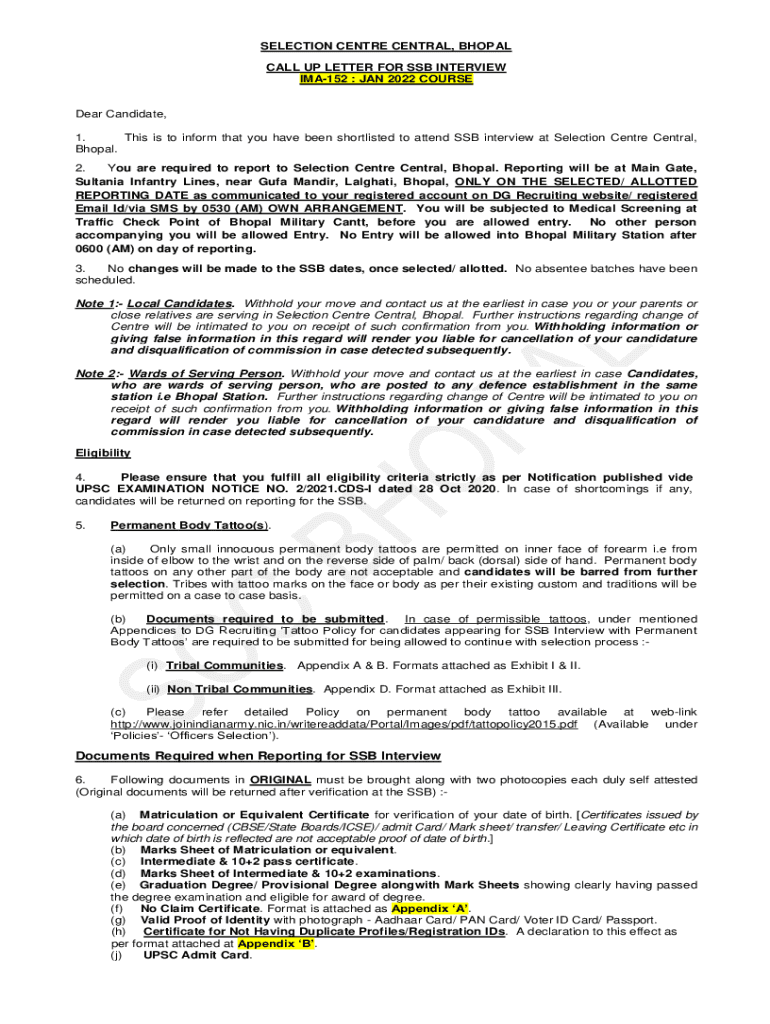 SELECTION Center CENTRAL, BHOPAL Calls UP LETTER FOR SSB INTERVIEW IMA152 : JAN 2022 COURSED ear Candidate, 1. This is to inform that you have been shortlisted to attend SSB interview at Selection