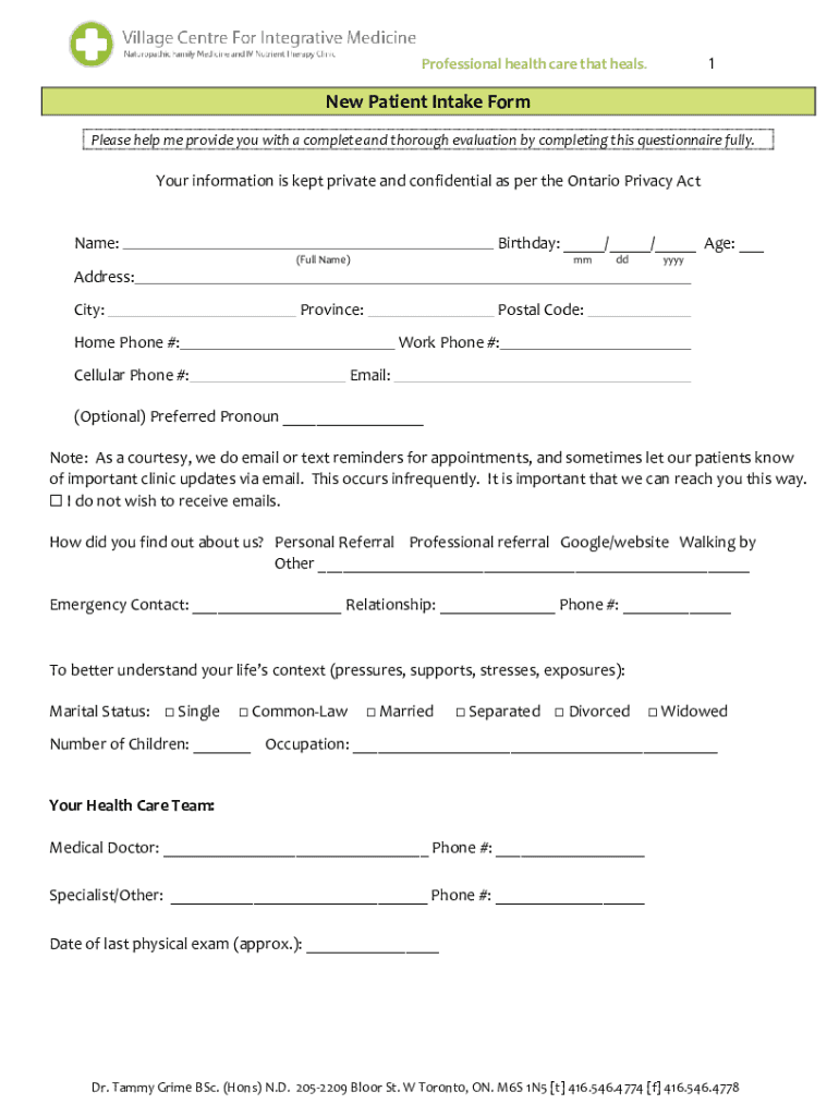 1Professional health care that heals. New Patient Intake Form Please help me provide you with a complete and thorough evaluation by completing this questionnaire fully. Your information is kept private