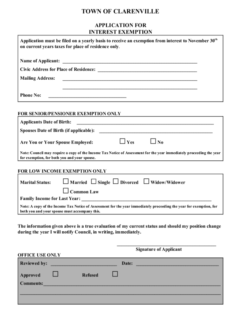 TOWN OF CLARKSVILLE APPLICATION FOR INTEREST EXEMPTION Application must be filed on a yearly basis to receive an exemption from interest to November 30th on current years taxes for place of residence