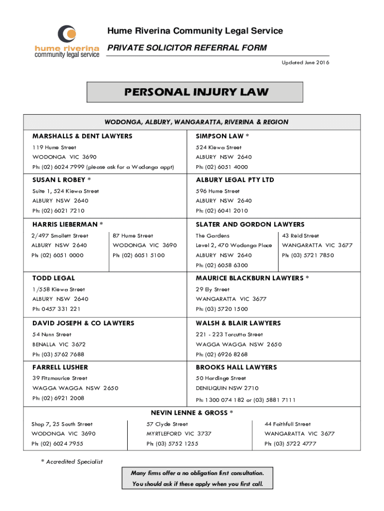 Hume Riverine Community Legal Service PRIVATE SOLICITOR REFERRAL FORM Updated June 2016PERSONAL INJURY LAW WODONGA, ALBURY, WANGARATTA, RIVER INA & REGION MARSHALL & DENT LAWYERSSIMPSON LAW *119 Hume
