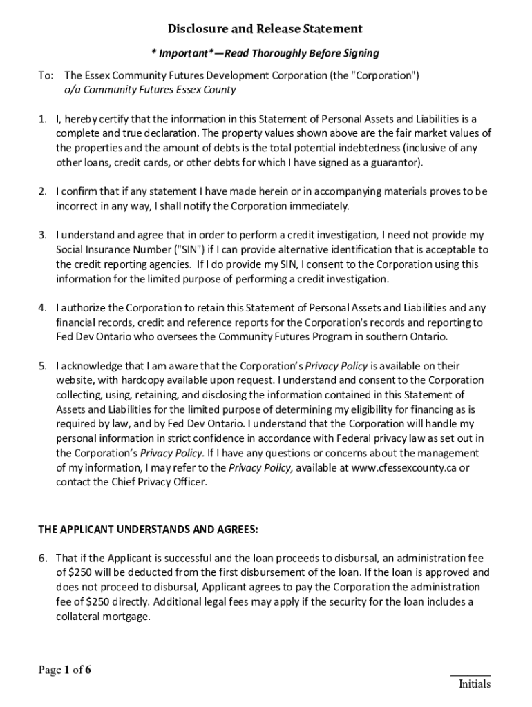 Disclosure and Release Statement * Important×Read Thoroughly Before Signing To: The Essex Community Futures Development Corporation (the \”Corporation\”) o/a Community Futures Essex County 1.
