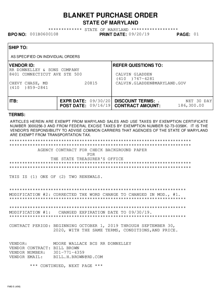 BLANKET PURCHASE ORDER STATE OF MARYLAND ************* STATE OF MARYLAND ****************** 001B0600108 BPO NO: PRINT DATE: 09/20/19 PAGE: 01 SHIP TO: AS SPECIFIED ON INDIVIDUAL ORDERSVENDOR ID: RR