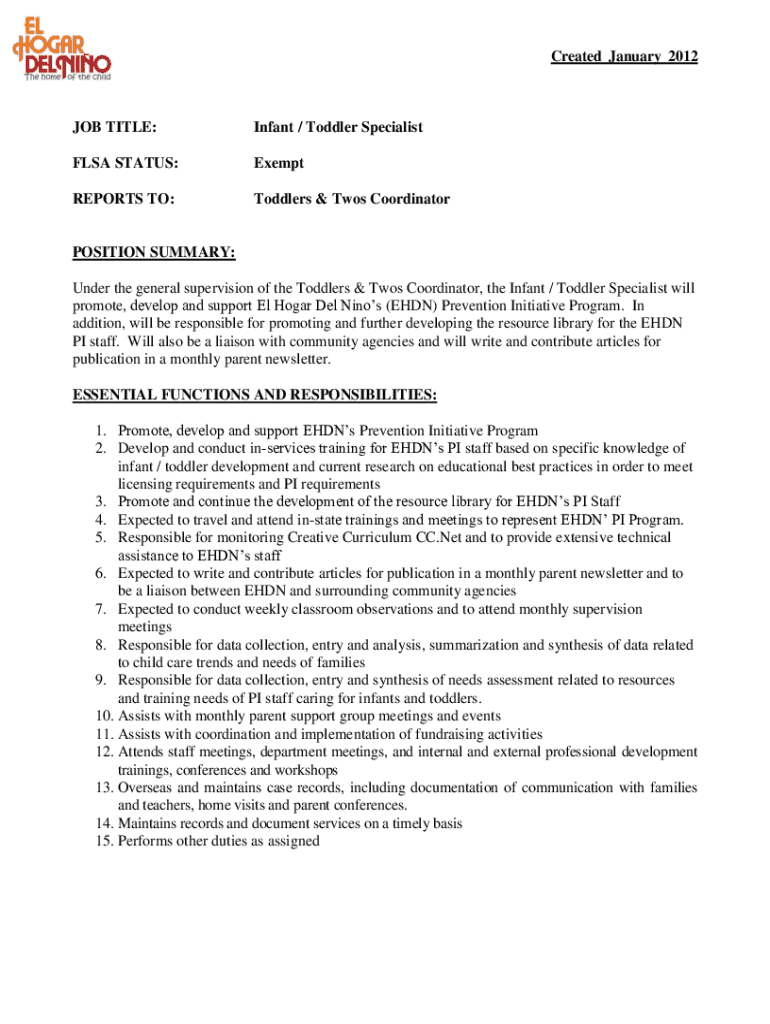Created January 2012JOB TITLE:Infant / Toddler Specialists STATUS:ExemptREPORTS TO:Toddlers & Twos CoordinatorPOSITION SUMMARY: