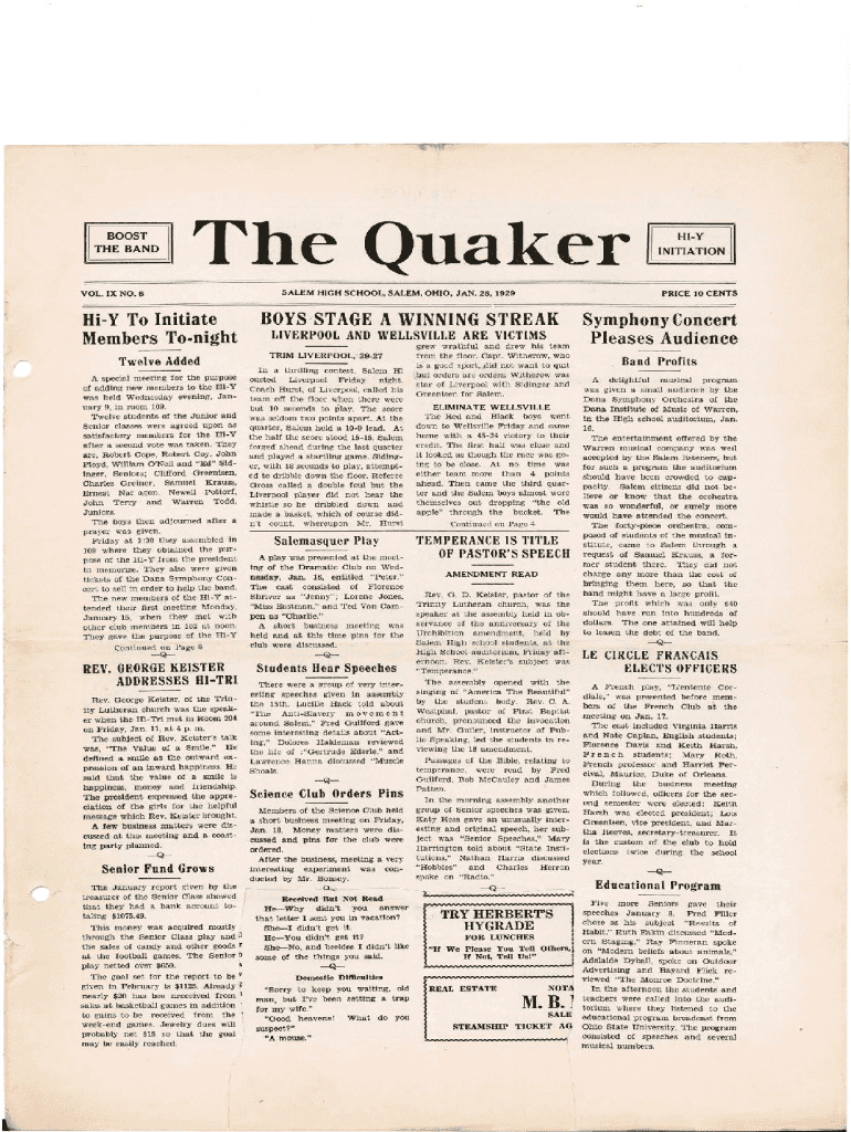 BOOST THE BAND0N, The Quaker l: l SNL SALEM HIGH SCHOOL, SALEM, OHIO, JAN. 28, 1929VOL. IXN0.8HiY To Initiate Members TonightPRICE 10 CENSORS STAGE A WINNING STREAK LIVERPOOL AND BELLEVILLE ARE VICTIMS