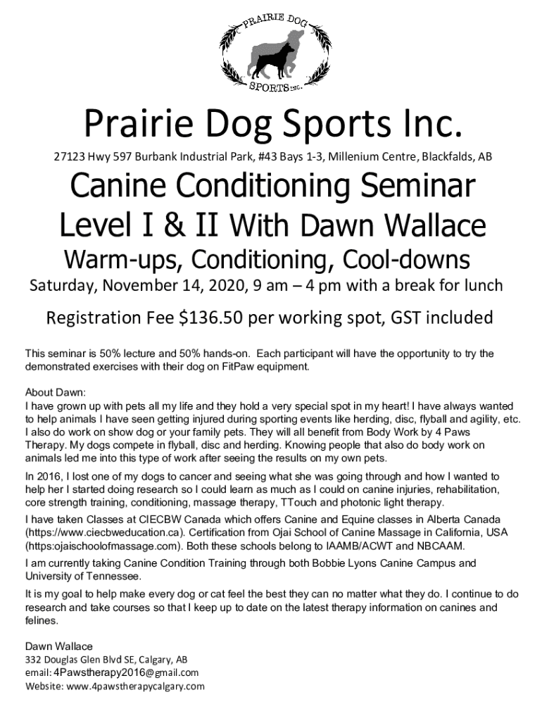 Prairie Dog Sports Inc.27123 Hwy 597 Burbank Industrial Park, #43 Bays 13, Millennium Center, Blackballs, Canine Conditioning Seminar Level I & II With Dawn Wallace Warm-ups, Conditioning, CooldownsSaturday,