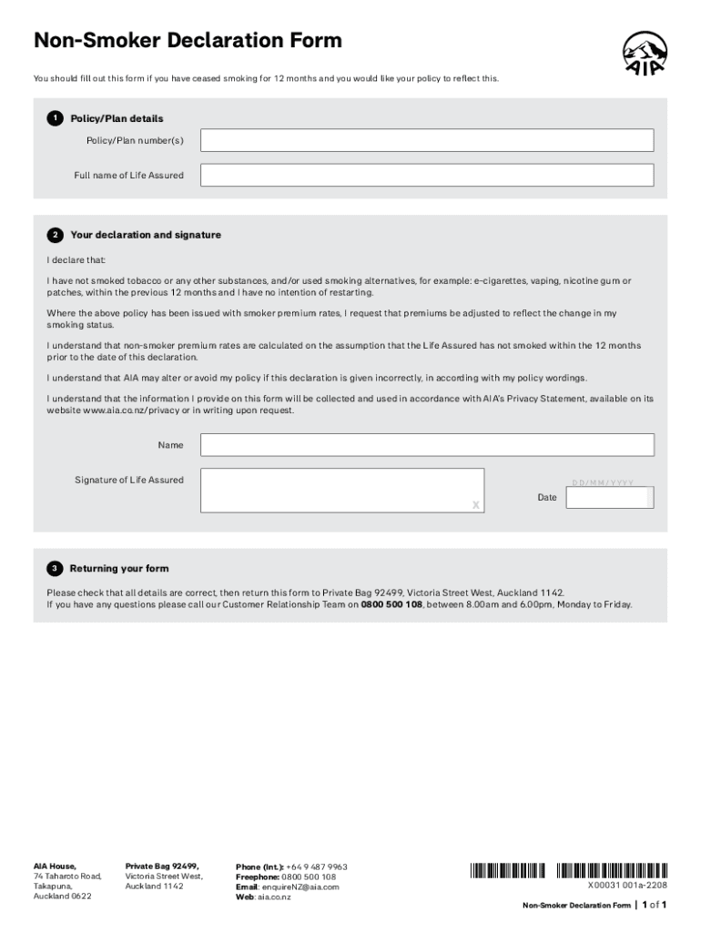 NonSmoker Declaration Form You should fill out this form if you have ceased smoking for 12 months, and you would like your policy to reflect this.1Policy/Plan details Policy/Plan number(s)Full name