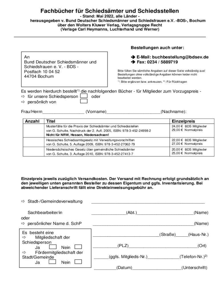 Fachbcher for Schiedsmter UND Schiedsstellen Stand: Mai 2022, all Under herausgegeben v. Band Deutsche Schiedsmnner UND Schiedsfrauen e.V. BDS, Bochum
