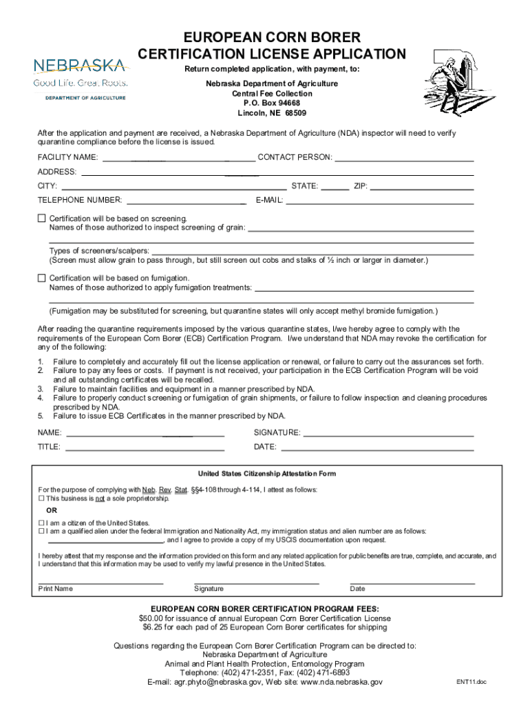 EUROPEAN CORN BORER CERTIFICATION LICENSE APPLICATION Return completed application, with payment, to: Nebraska Department of Agriculture Central Fee Collection P.O. Box 94668 Lincoln, NE 68509 After