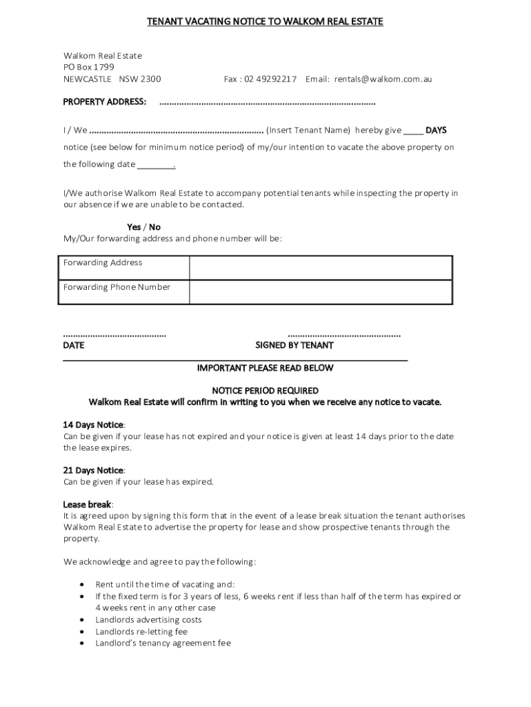 TENANT VACATING NOTICE TO WALK OM REAL ESTATE