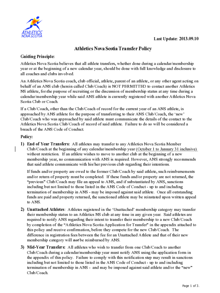 Last Update: 2013.09.10Athletics Nova Scotia Transfer Policy Guiding Principle: Athletics Nova Scotia believes that all athlete transfers, whether done during a calendar/membership year or at the