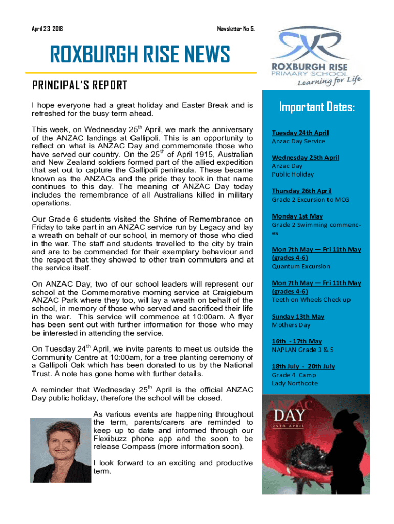 April 23 2018Newsletter No 5.REXBURG RISE NEWS PRINCIPALS REPORT I hope everyone had a great holiday and Easter Break and is refreshed for the busy term ahead. This week, on Wednesday 25th April,