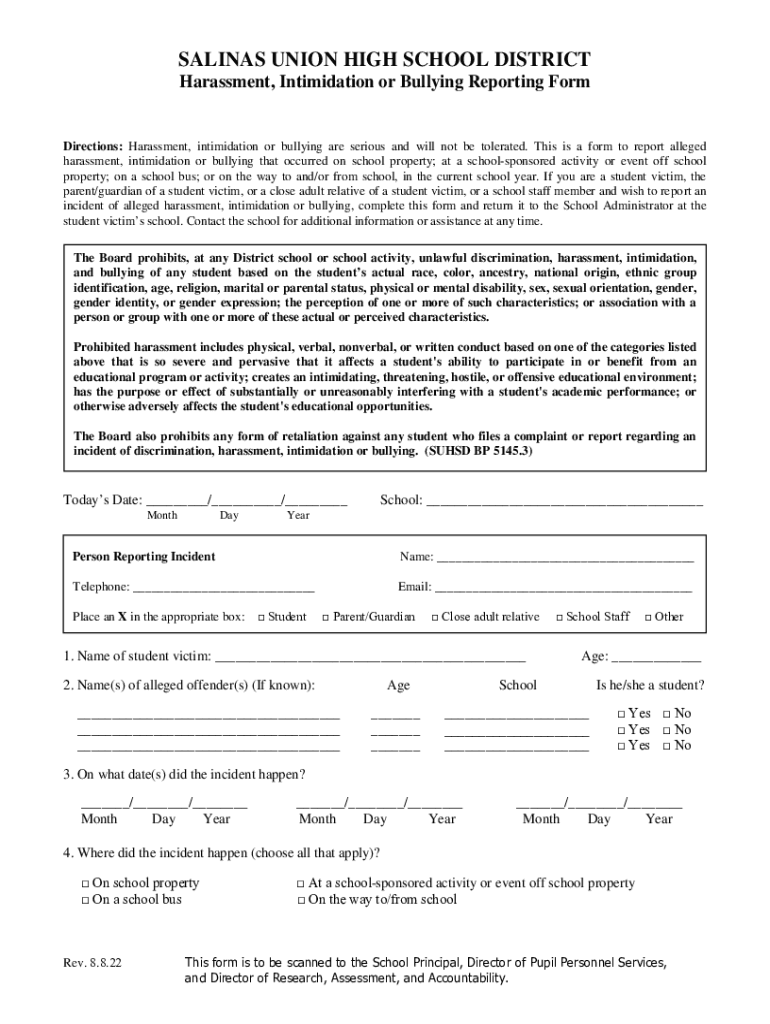 SALINAS UNION HIGH SCHOOL DISTRICT Harassment, Intimidation or Bullying Reporting Redirections: Harassment, intimidation or bullying are serious and will not be tolerated. This is a form to report