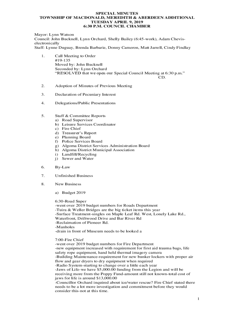 SPECIAL MINUTES TOWNSHIP OF MACDONALD, MEREDITH & ABERDEEN ADDITIONAL TUESDAY, APRIL 9, 2019 6:30 P.M. COUNCIL CHAMBER Mayor: Lynn Watson Council: John Bucknell, Lynn Orchard, Shelly Bailey (6:45work),