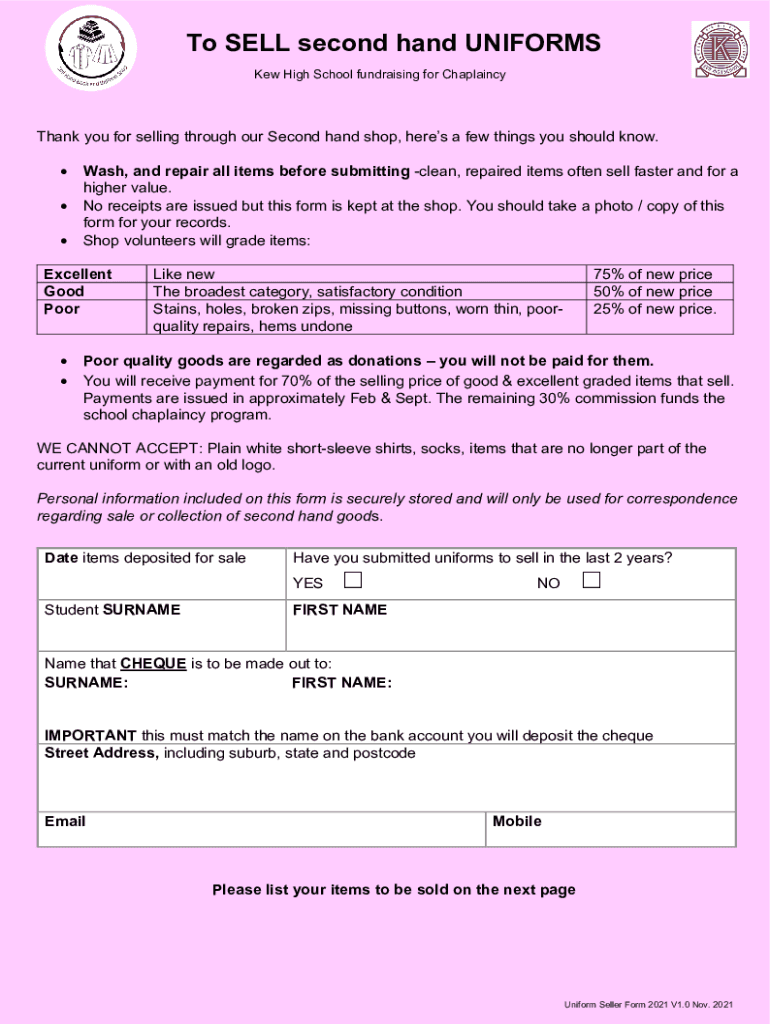 To SELL second hand UNIFORMS New High School fundraising for ChaplaincyThank you for selling through our Second hand shop, here's a few things you should know. Wash, and repair all items before submitting