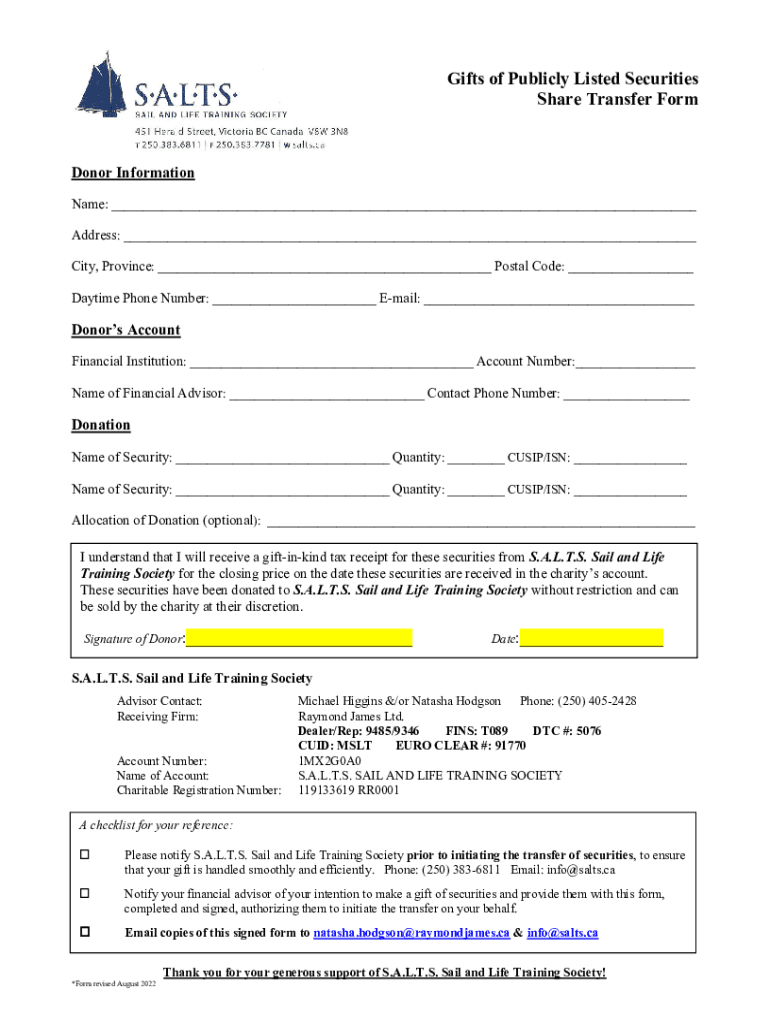 Gifts of Publicly Listed Securities Share Transfer Foredoom Information Name: ___ Address: ___ City, Province: ___ Postal Code: ___ Daytime Phone Number: ___ Email: ___Donors Account Financial Institution: