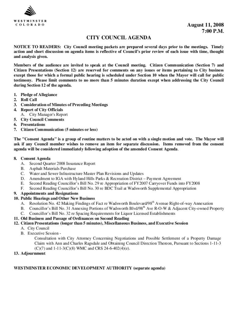 August 11, 2008 7:00 P.M.C O L O R A DO CITY COUNCIL AGENDA NOTICE TO READERS: City Council meeting packets are prepared several days prior to the meetings. Timely action and short discussion on agenda