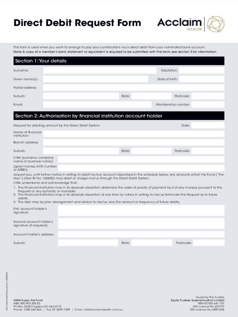 Direct Debit Request Form This form is used when you want to arrange to pay your contributions via a direct debit from your nominated bank account. Note: A copy of a members bank statement or equivalent
