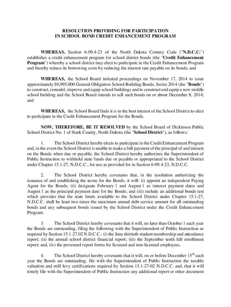 RESOLUTION PROVIDING FOR PARTICIPATION IN SCHOOL BOND CREDIT ENHANCEMENT PROGRAMWHEREAS, Section 609.423 of the North Dakota Century Code (\”N.D.C.C.\”) establishes a credit enhancement program