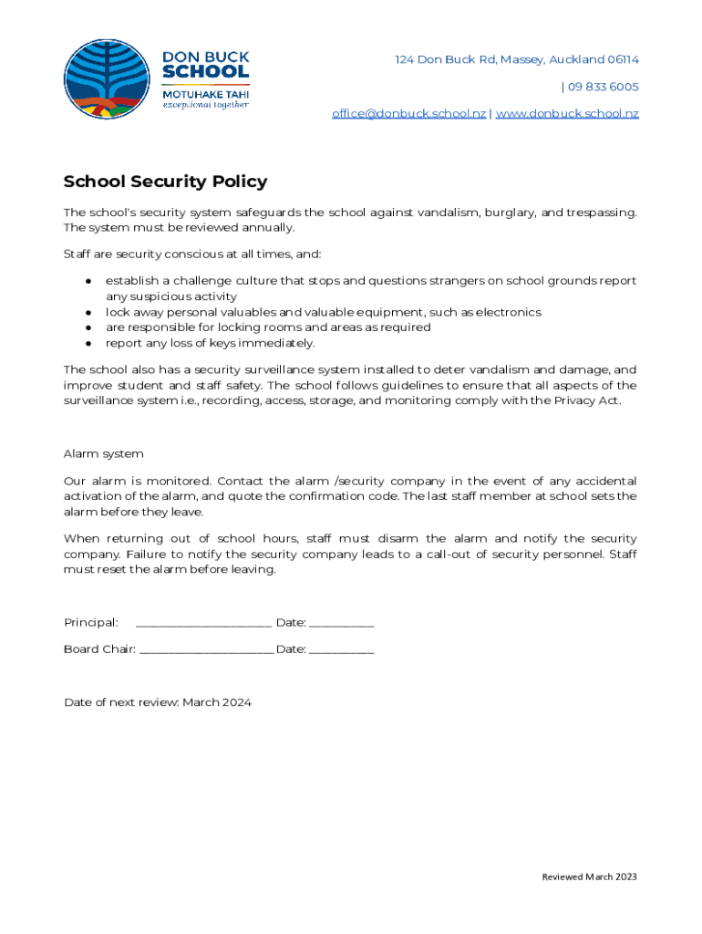 124 Don Buck Rd, Massey, Auckland 06114 | 09 833 6005 ofce@donbuck.school.nz | www.donbuck.school.nzSchool Security Policy The school\'s security system safeguards the school against vandalism, burglary,