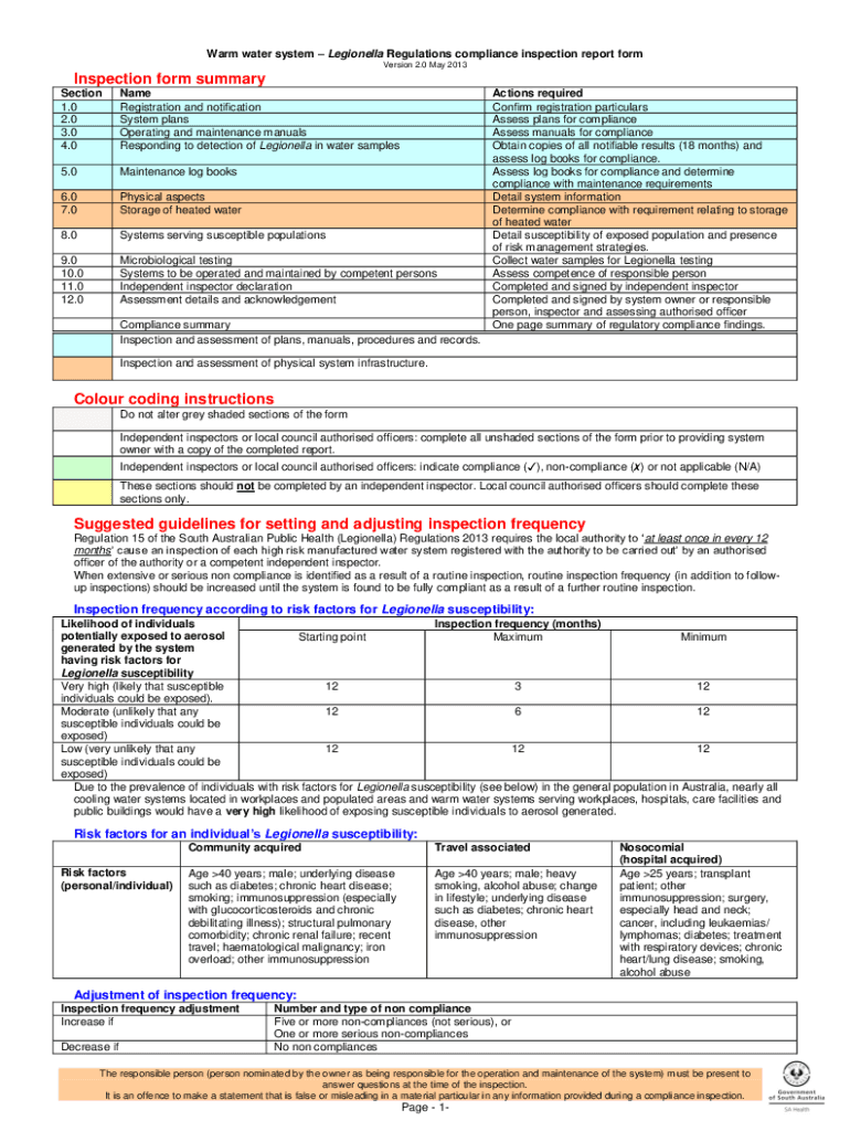 Warm water system Regionally Regulations compliance inspection report form Version 2.0 May 2013Inspection form summary Section 1.0 2.0 3.0 4.0Name Registration and notification System plans Operating