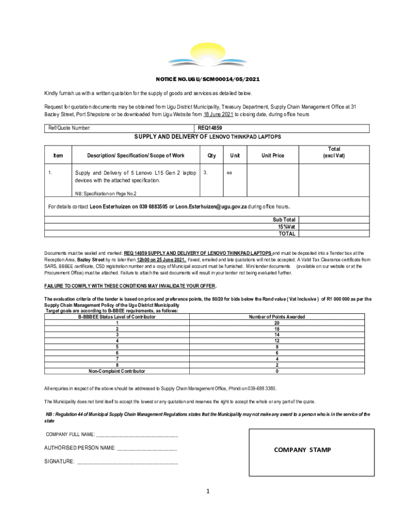 NOTICE NO.UGU/SCM00014/05/2021 Kindly furnish us with a written quotation for the supply of goods and services as detailed below. Request for quotation documents may be obtained from UGU District