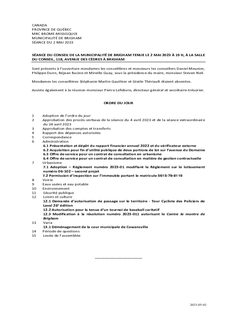 SINCE DU 2 MAI 2023SANCE DU CONSENT DE LA MUNICIPALITY DE BRIGHAM TENURE LE 2 MAI 2023 19 H, LA SALE