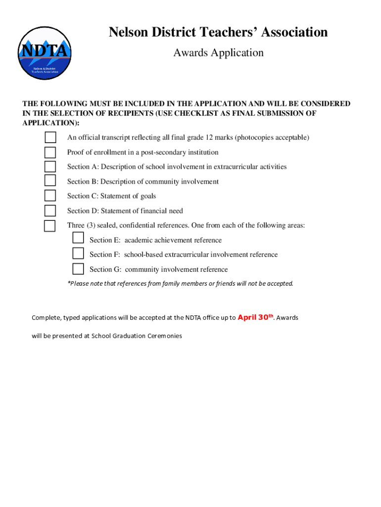 Nelson District Teachers Association Awards Application FOLLOWING MUST BE INCLUDED IN THE APPLICATION AND WILL BE CONSIDERED IN THE SELECTION OF RECIPIENTS (USE CHECKLIST AS FINAL SUBMISSION OF APPLICATION):