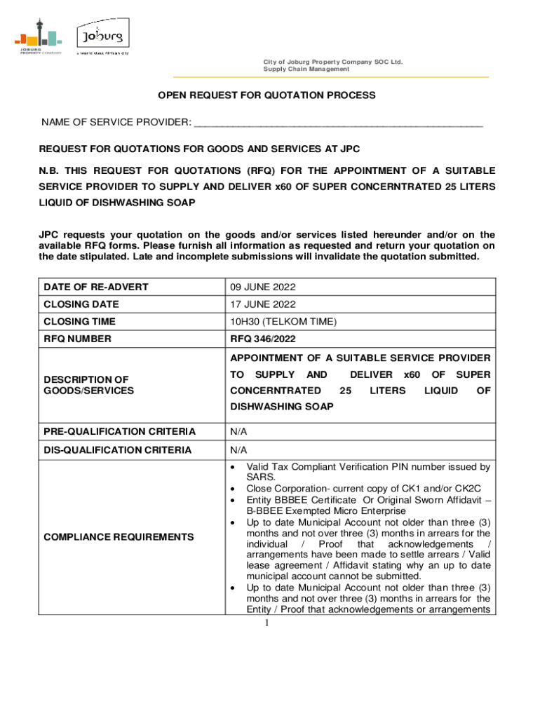 City of Jo burg Property Company SOC Ltd. Supply Chain ManagementOPEN REQUEST FOR QUOTATION PROCESS NAME OF SERVICE PROVIDER: ___ REQUEST FOR QUOTATIONS FOR GOODS AND SERVICES AT PC N.B. THIS REQUEST