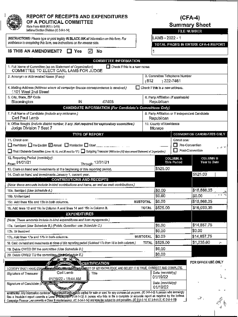 REPORT OF RECEIPTS AND EXPENDITURES OF A POLITICAL COMMITTEE(CFA4) Summary Superstate Form 4606 (R15 I 519) Indiana Election Division (IC 39514)INSTRUCTIONS: Please type or print legibly IN BLACK