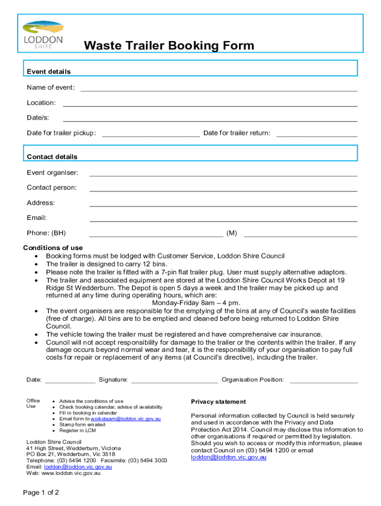 Waste Trailer Booking Form Event details Name of event: Location: Date/s: Date for trailer pickup:Date for trailer return:Contact details Event organizer: Contact person: Address: Email: Phone: (BH)(M)Conditions