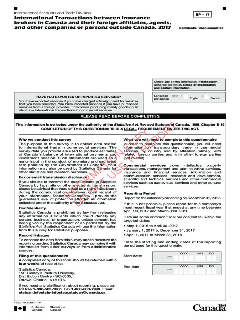 International Accounts and Trade Division BP 17International Transactions between insurance brokers in Canada and their foreign affiliates, agents, and other companies or persons outside Canada, 2017Confidential