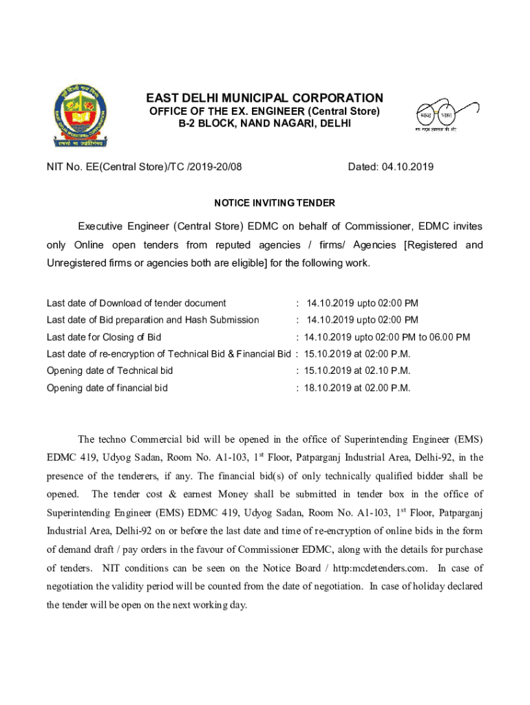 EAST DELHI MUNICIPAL CORPORATION OFFICE OF THE EX. ENGINEER (Central Store) B2 BLOCK, NAND NAG ARI, DELIMIT No. EE(Central Store)/TC /201920/08Dated: 04.10.2019NOTICE INVITING TENDERExecutive Engineer