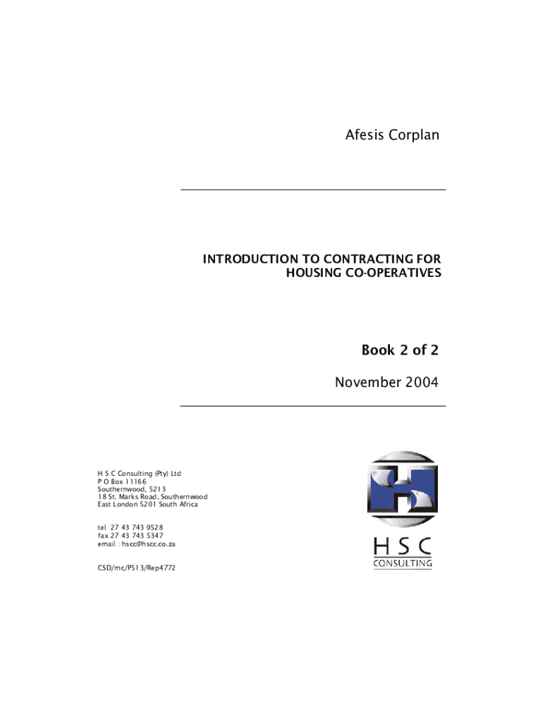 Thesis CorplanINTRODUCTION TO CONTRACTING FOR HOUSING COOPERATIVESBook 2 of 2 November 2004H S C Consulting (Pty) Ltd P O Box 11166 Southern wood, 5213 18 St. Marks Road, Southern wood East London