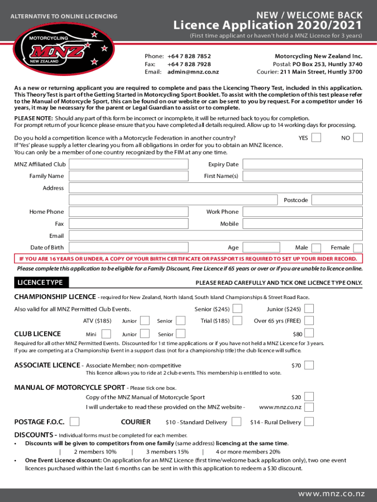 NEW / WELCOME BACKALTERNATIVE TO ONLINE LICENCINGLicence Application 2020/2021(First time applicant or haven't held an MNA License for 3 years)Phone:+64 7 828 7852