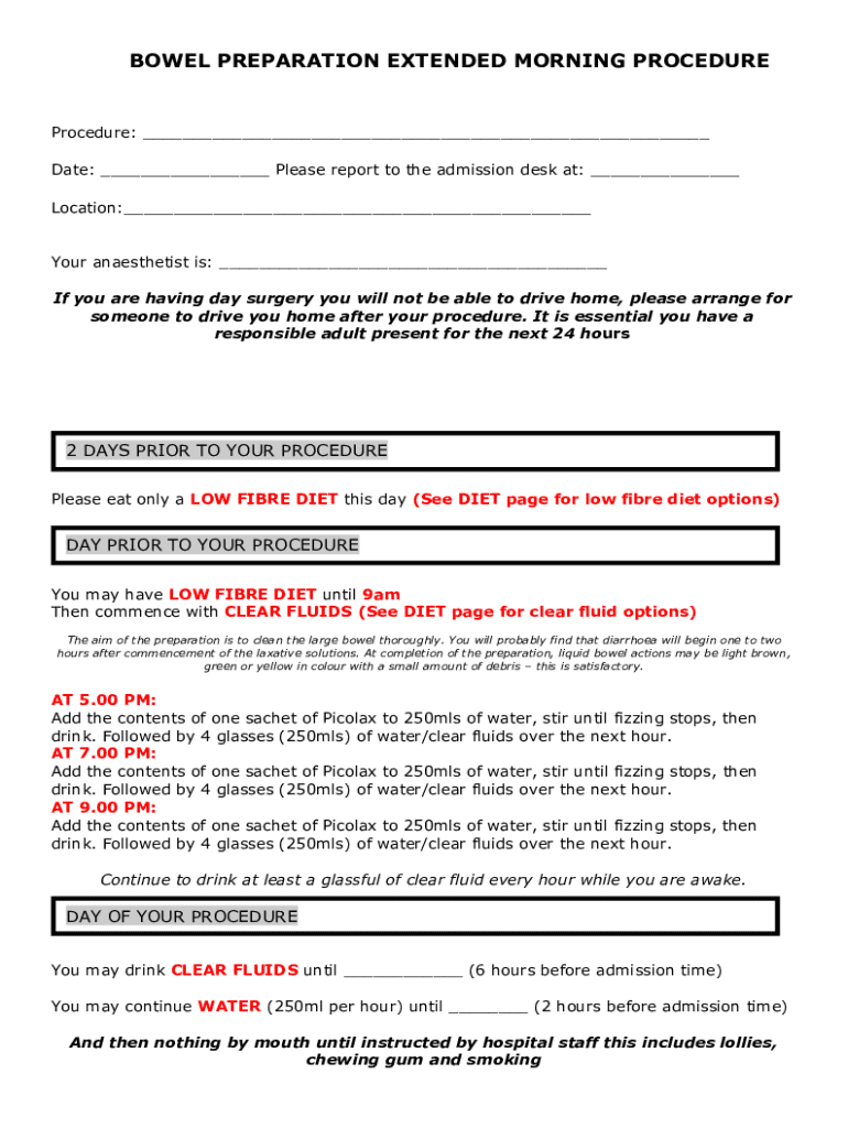 BOWEL PREPARATION EXTENDED MORNING PROCEDUREProcedure: ___ Date: ___ Please report to the admission desk at: ___ Location:___ Your anesthetist is: ___ If you are having day surgery you will not be